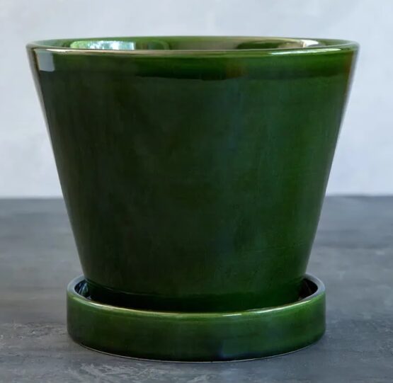 En fantastisk stilren lerkrukke som passer alle steder og er dejligt afdæmpet. Med underskål og hul i bunden – man kan med fordel lige sætte et par filtdutter under underskålen, så bord eller vindueskarm ikke tager farve fra krukken.